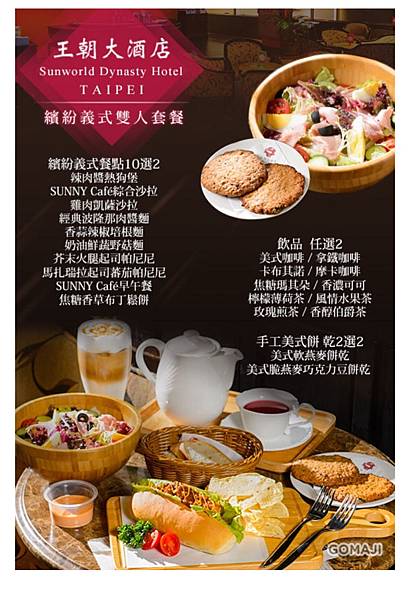 昨天晚上剛好有空到台北吃晚餐因為要在小巨蛋附近吃就選了團購上的王朝大酒店新開的義式餐廳兩個人才499 覺得cp值很高先看一下gomaji的圖 對了 先查了一下消費一千才能抵一小時停車一小時停車100元 超貴的只好乖乖停路邊停車格